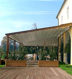 Terrasoverkappingen & Verandazonweringen Nog meer genieten van uw terras? Al aan terrasoverkapping gedacht? Zo brengt u er veel meer aangename uurtjes door - lekker beschut tegen een te felle zon, matige regen en wind. Er zijn ook terrasoverkappingen voor de horeca. De voordelen: overdekt erg grote oppervlakten de doeken in acrylvezel zijn water- en vuilafstotend én schimmelwerend standaard uitgerust met een elektrische motor modulair koppelbaar: een gedeelte van het terras in het zonnetje zetten en een ander in de schaduw vormt geen probleem meerdere opties verkrijgbaar: watergoten, afvoerbakjes, zijdoeken, zijdelingse wind- en regenbeveiliging, reclamebeschilderingen... |